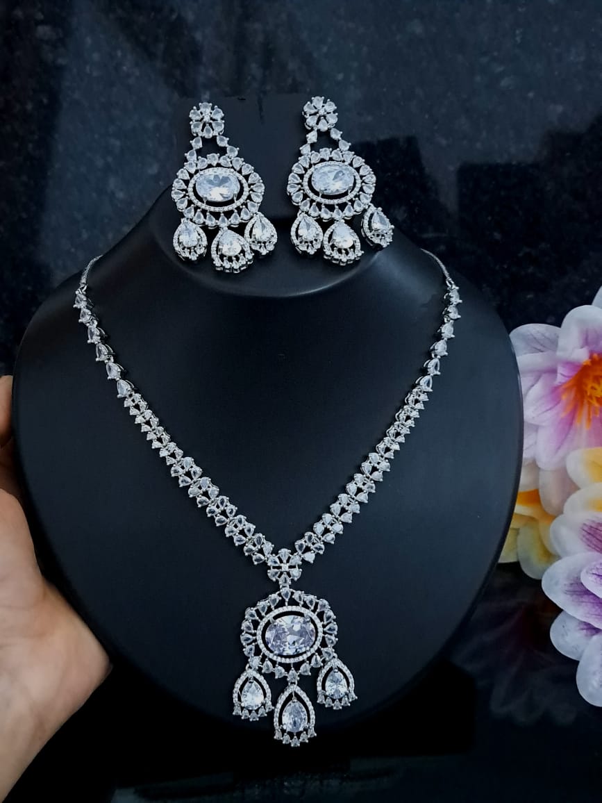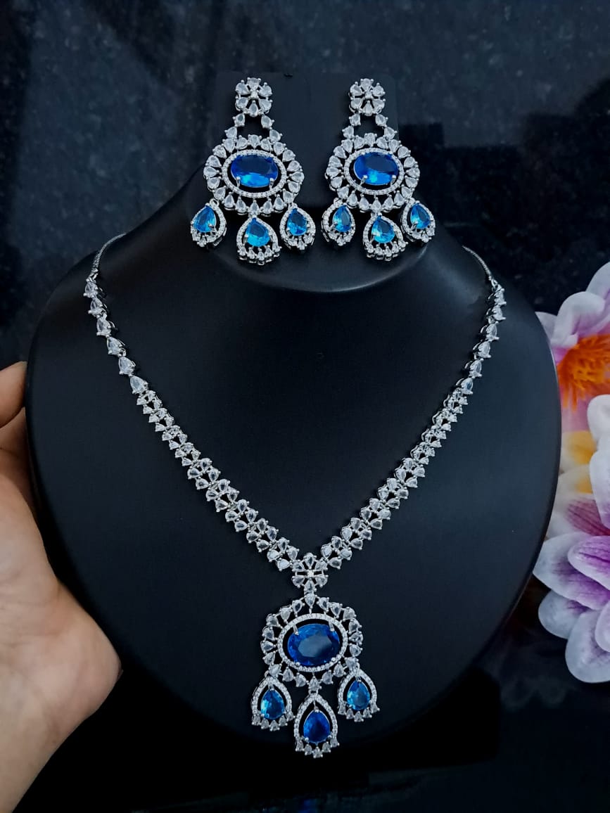 This captivating AD necklace features a striking blue center oval stone, radiating a vibrant hue that catches the light with every movement. The deep, rich blue of the central stone is surrounded by a halo of sparkling American Diamonds (AD), enhancing its brilliance and giving it an enchanting glow. Adding to its elegance, three AD drop stones elegantly dangle from the centerpiece, creating a delicate cascading effect. These drop stones, crafted with precision, shimmer with every angle, adding depth and dimension to the design. The necklace's chain is uniquely crafted from a series of smaller AD drop stones, which seamlessly flow along the neckline, offering a refined and cohesive look. The chain not only complements the central design but also ensures a graceful and sophisticated appearance. This necklace is perfect for formal occasions, adding a touch of glamour and sophistication, while the blue center stone offers a pop of color that makes the piece truly stand out. By purchasing wholesale, you can tap into these timeless designs at highly competitive prices, perfect for both personal collections and retail businesses. With unbeatable prices and exceptional quality, Indian wholesale jewelry is the perfect choice for those looking to add a touch of elegance to their collection without spending a fortune.