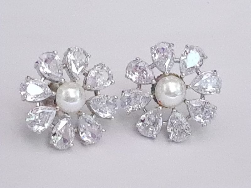 Floral designer stud silver white