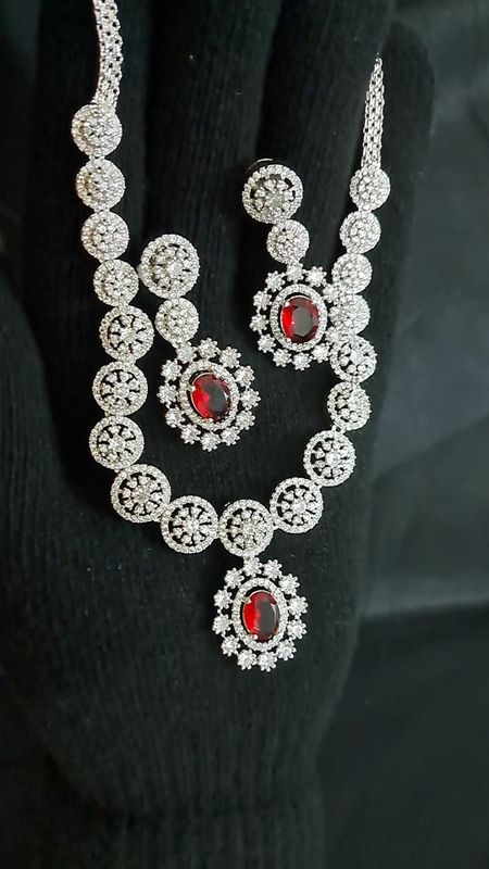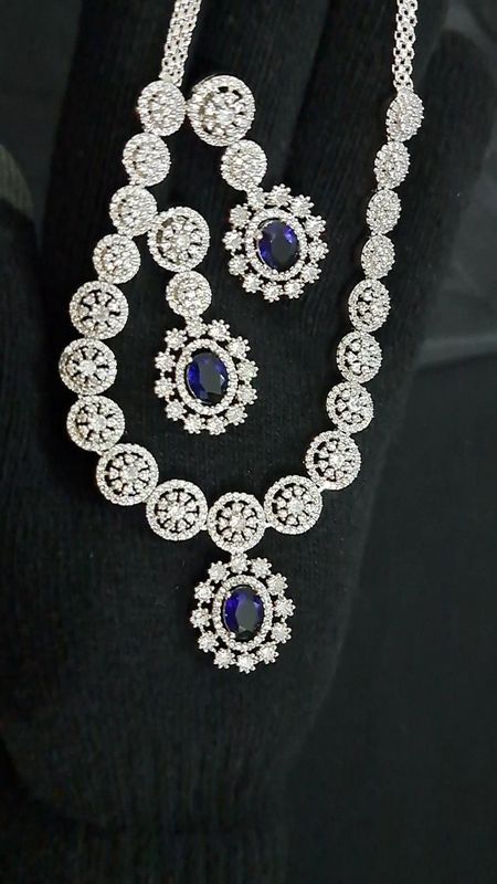 A budget-friendly necklace set available for wholesale and retail, featuring a rich sparkling look with round designs and a centerpiece pendant adorned with a colorful oval stone. The earrings are striking, with an oval-round shape and large stones dangling in the center. Perfectly affordable for any budget, this makes a thoughtful anniversary gift for her. Retailers can shop online at Star Divine and take advantage of wholesale coupons and special offers.