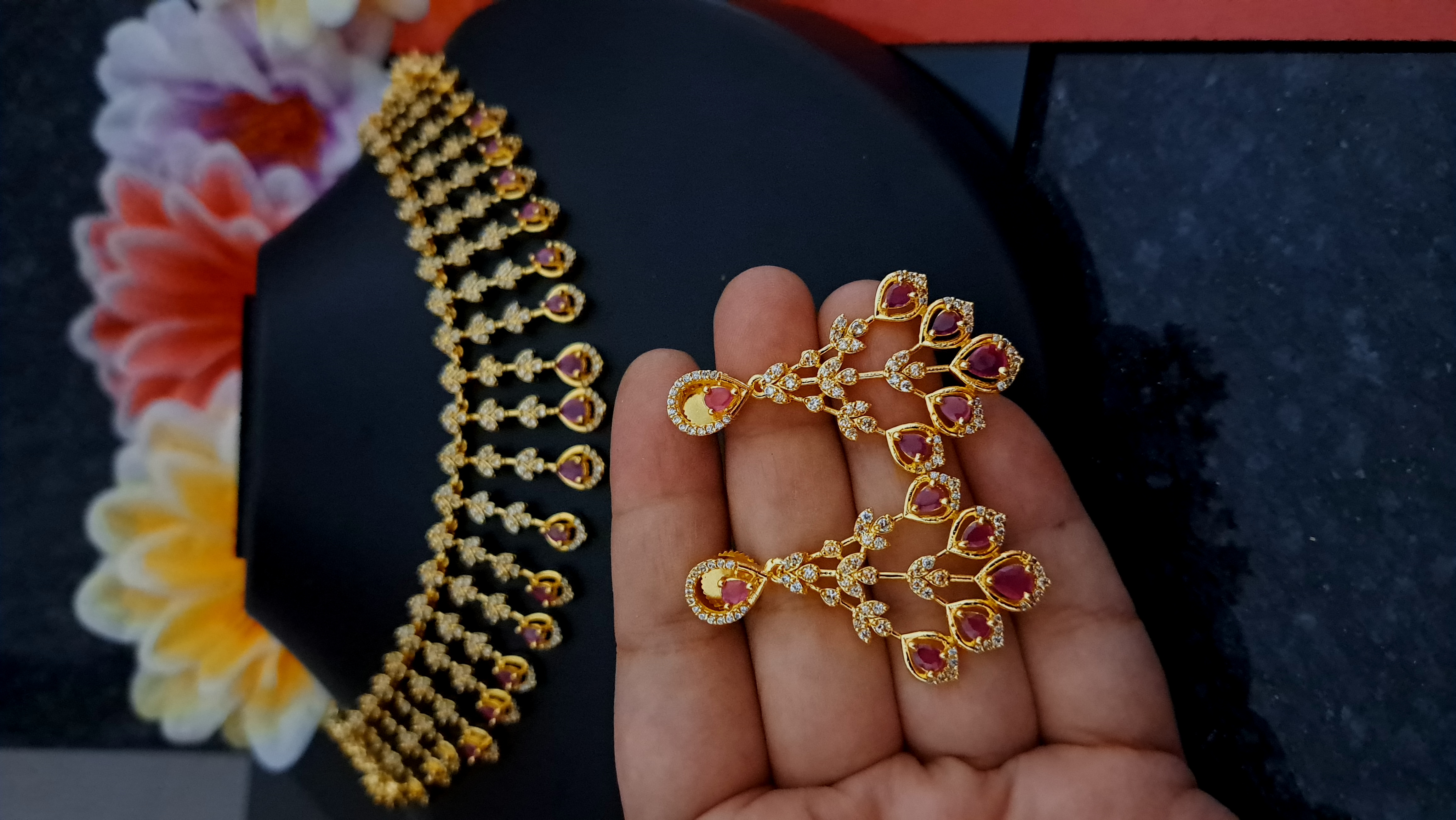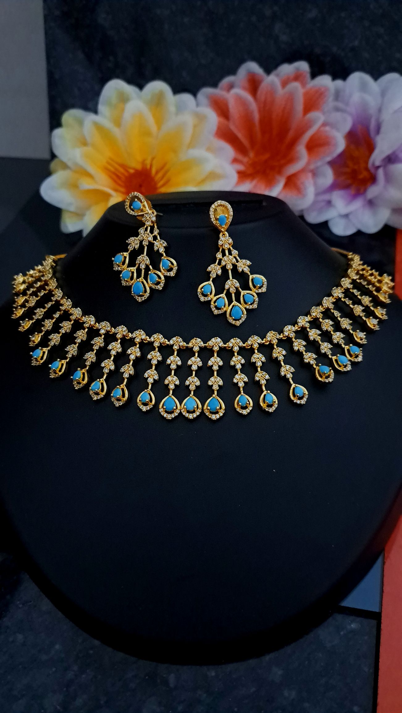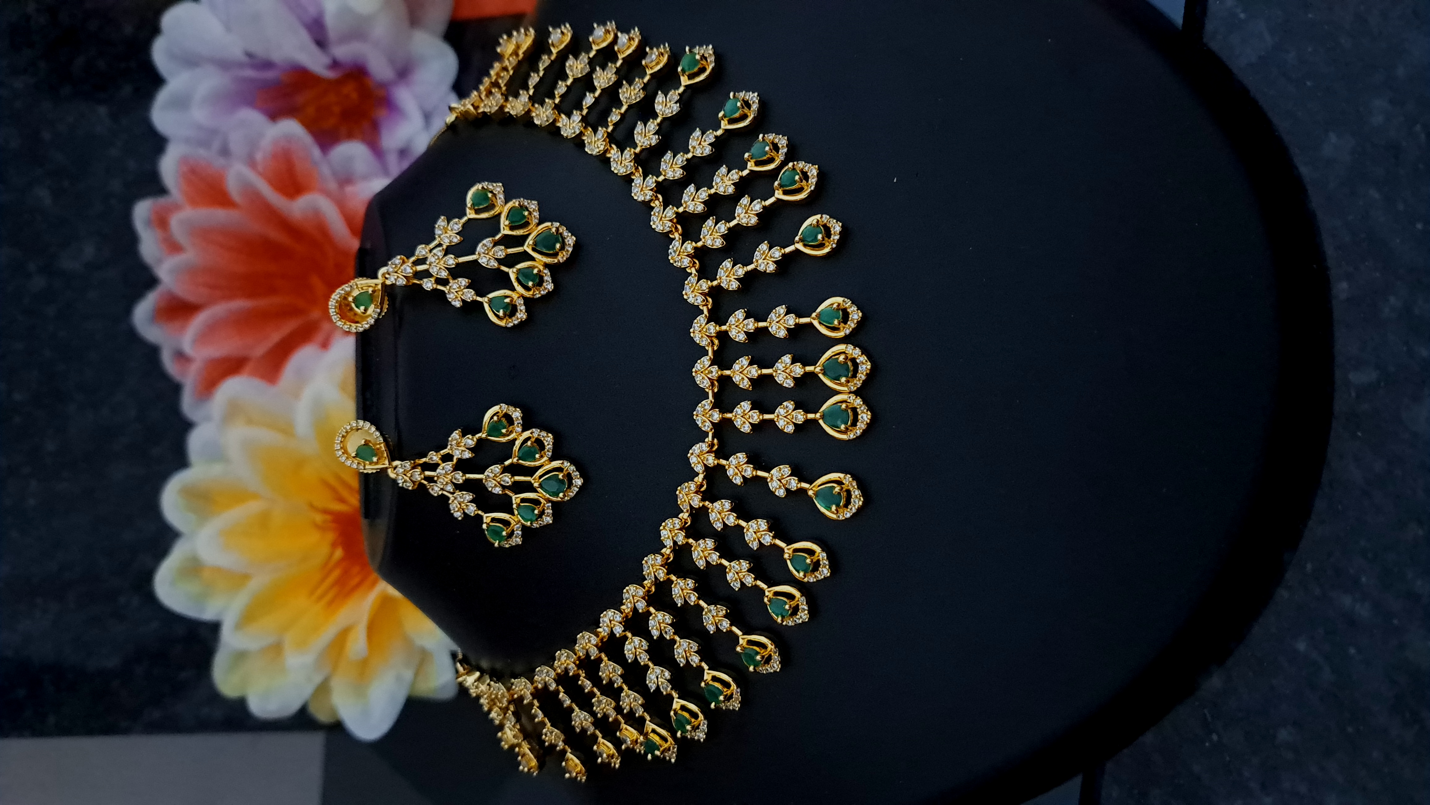 High-quality American Diamond stones are used in this Indian handmade jewelry, available at StarDivine for both wholesale and retail. You can purchase from our store individually or in bulk. This glamorous wide necklace features sparkling AD stones in a golden hue. With long-lasting color, it can be enjoyed for a long time with proper care. Our jewelry is nickel-free and made from durable brass alloy. For added trust, we’ve been selling online for 19 years. Explore our stunning collection of American Diamond necklaces, known for their exceptional shine. We also accept custom orders if they meet our requirements. Explore our AD small necklace collection for some stunning designs at the best prices. Reach out to us for seasonal offers and discounts and enjoy additional savings with discount coupons on your orders. Get the best deals with StarDivine!