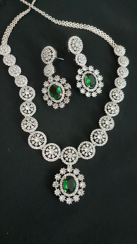 A budget-friendly necklace set available for wholesale and retail, featuring a rich sparkling look with round designs and a centerpiece pendant adorned with a colorful oval stone. The earrings are striking, with an oval-round shape and large stones dangling in the center. Perfectly affordable for any budget, this makes a thoughtful anniversary gift for her. Retailers can shop online at Star Divine and take advantage of wholesale coupons and special offers.