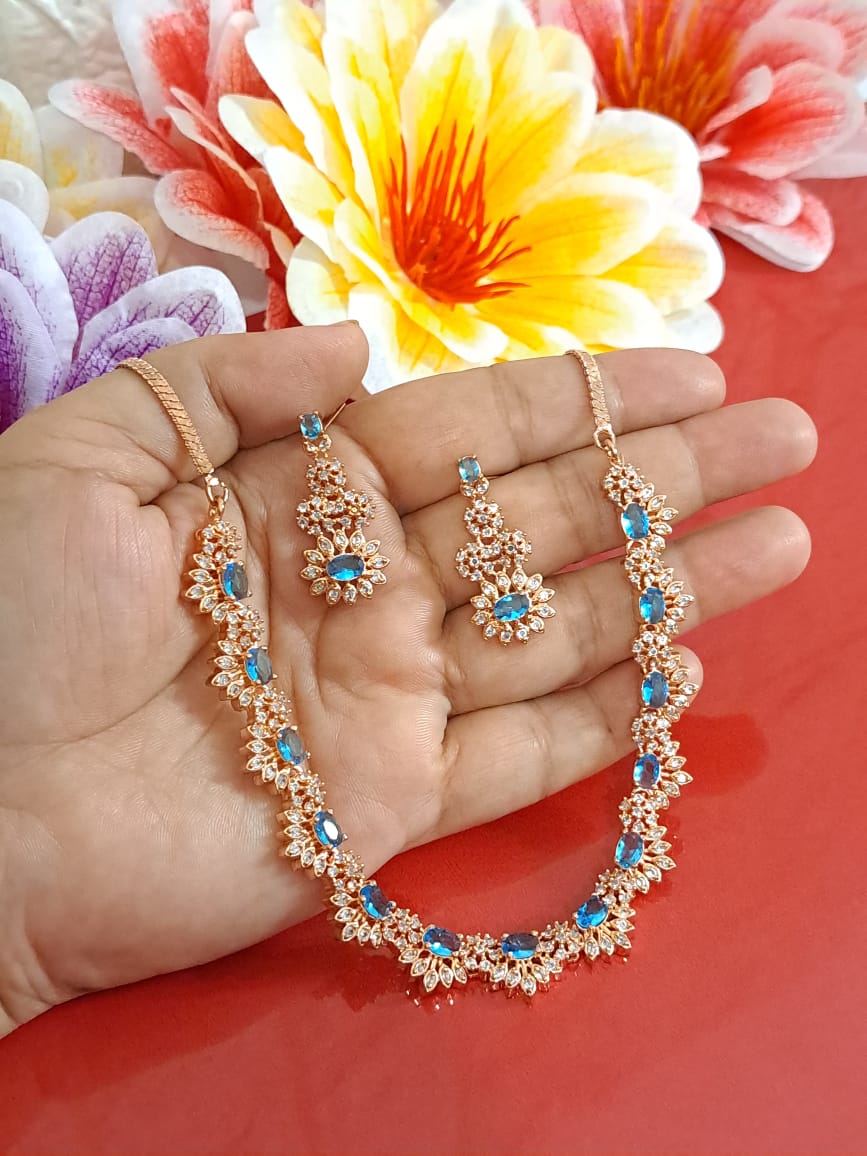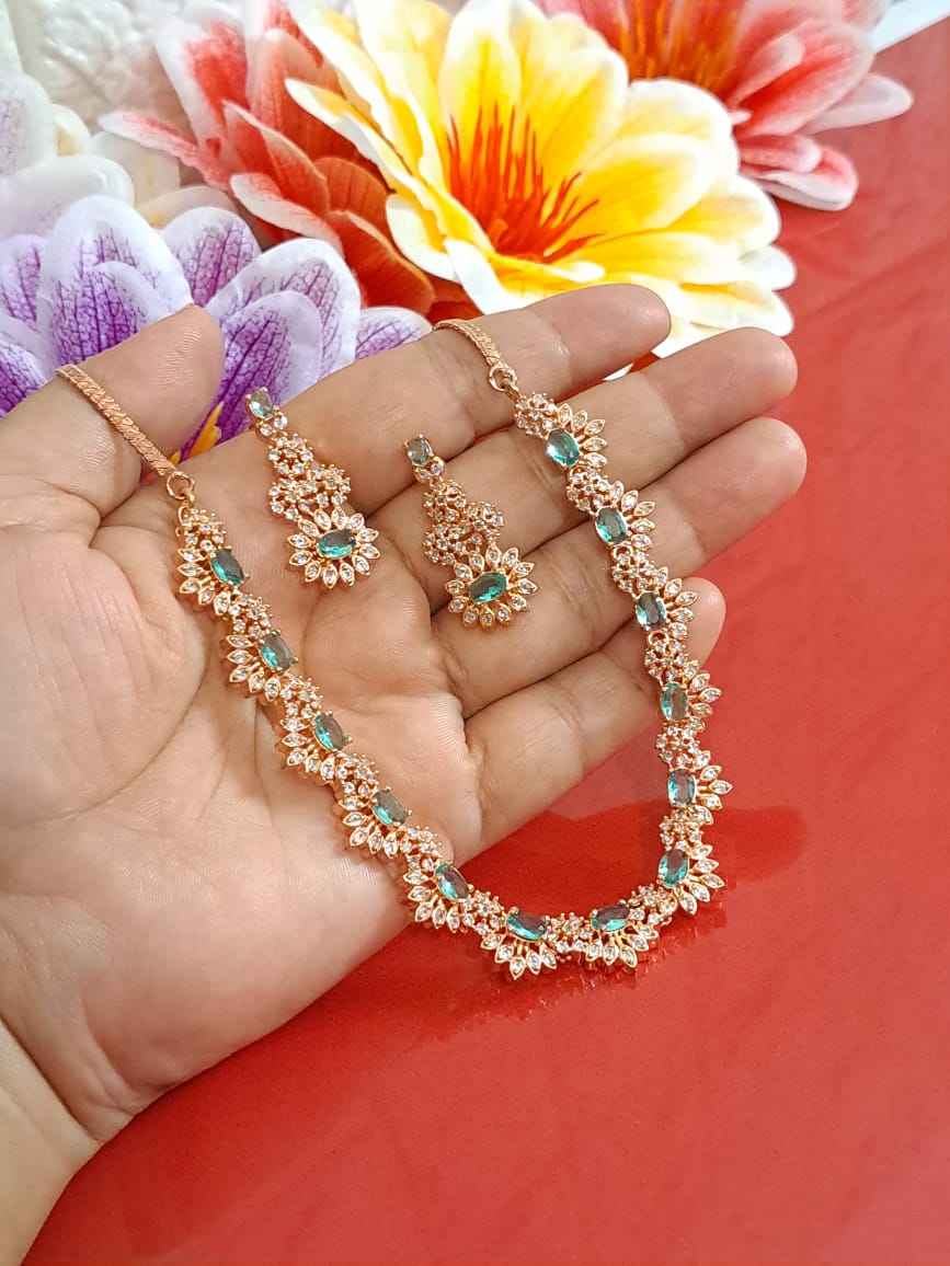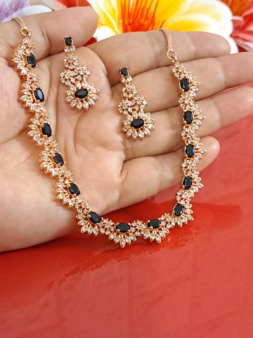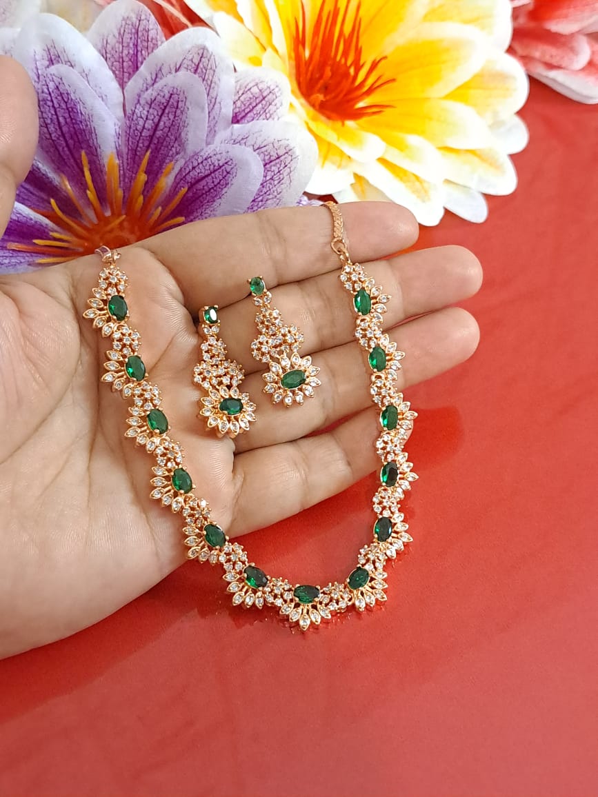 Shop Online for Budget Low price American Diamond Necklaces. Shop wholesale in bulk for your store. This necklace is available in different colors and rhodium plated. We take custom orders as well.
