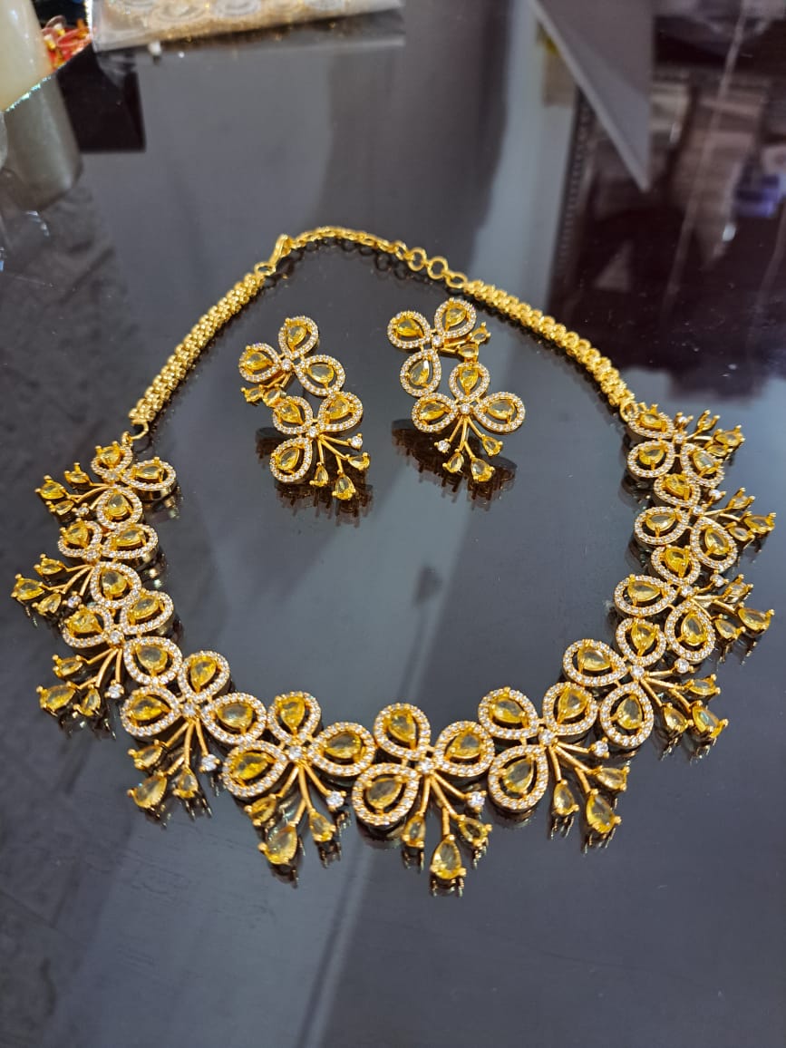 The Golden Sunshine Floral AD Necklace Set from Star Divine is a brilliant piece that oozes style and appeal. Planned with complicated flower designs and a shocking brilliant completion, this neckband set is the exemplification of refinement. Matched with matching studs of a similar plan and variety, it makes an agreeable and spellbinding look, ideal for any event. Available in different color options. A radiant masterpiece that redefines elegance and charm - Step into the spotlight with the Golden Sunshine Floral AD Necklace Set from Star Divine. If you're looking to buy American diamond necklace set online, wholesale or retail, this stunning piece deserves a top spot in your collection. Design & Craftsmanship Floral Fantasy: Intricately crafted with delicate floral motifs, this necklace set captures the essence of nature’s beauty in shimmering American diamonds. Golden Glow: The brilliant gold plating adds warmth and richness, making the set ideal for both traditional and contemporary outfits. Color Stone Accents: Embedded with vibrant color stones, the necklace offers a playful yet regal touch that enhances its visual appeal. Complete the Look Matching Earrings: The set includes coordinated earrings that mirror the necklace’s design and color palette, creating a harmonious and captivating ensemble. Occasion-Ready: Whether it’s a wedding, festive celebration, or a glamorous evening out, this set ensures you shine with sophistication. Can Custom make for Stone color and metal color for bulk buy wholesale, on order. Time taken for custom making 20 days to a month.